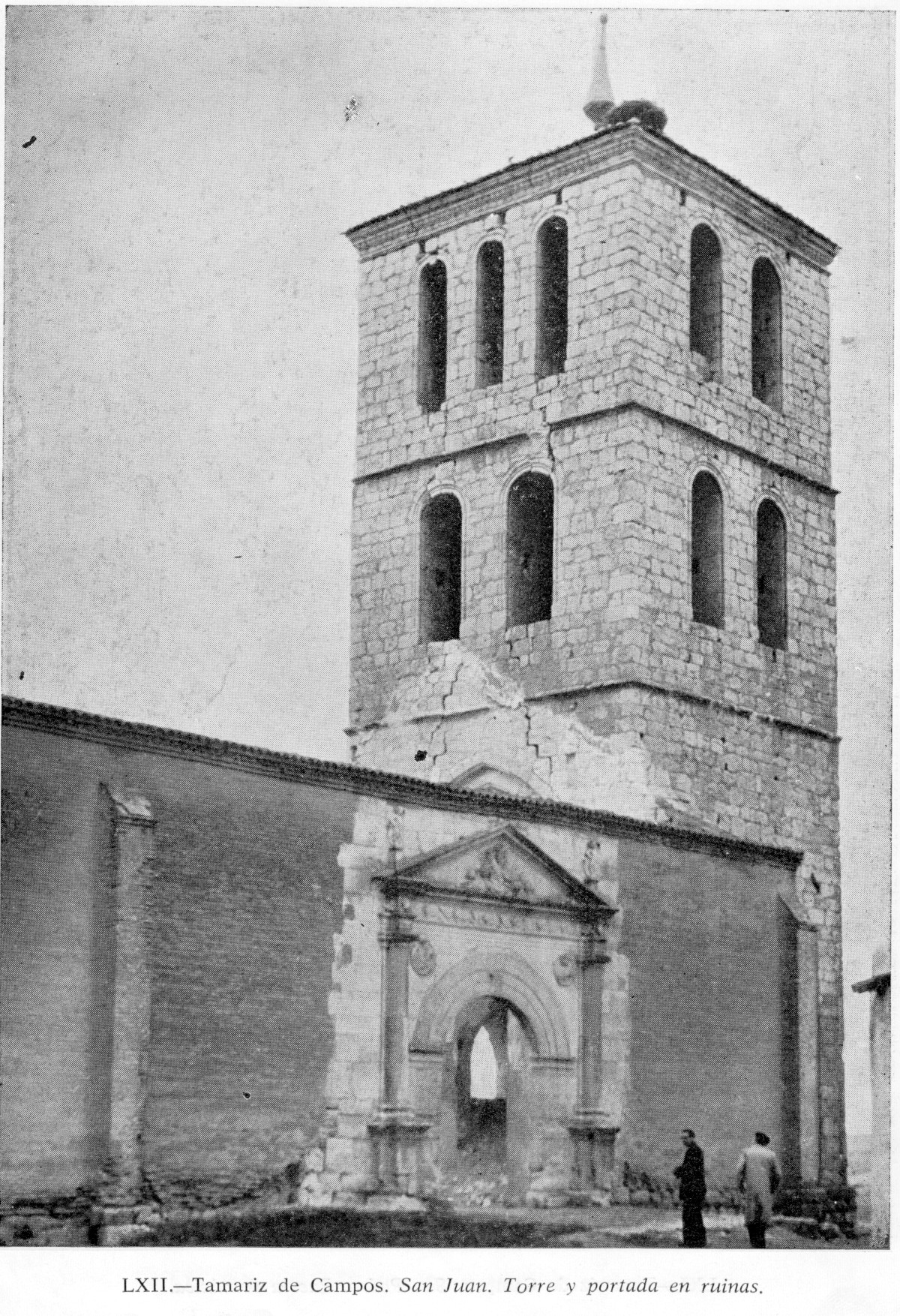 Estado actual: La torre presenta graves daños estructurales y riesgo de derrumbe inminente. La portada renacentista también está en peligro si la torre cae.